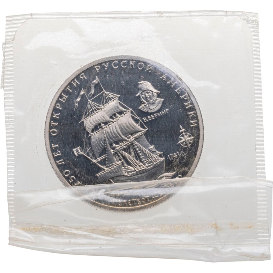 Купить Памятный жетон Межнумизматики "250-летие открытия Русской Америки: пакетбот Св. Петр 1741 г." в запайке, ММД, 1990-е гг.