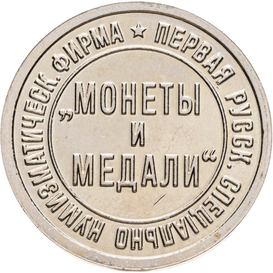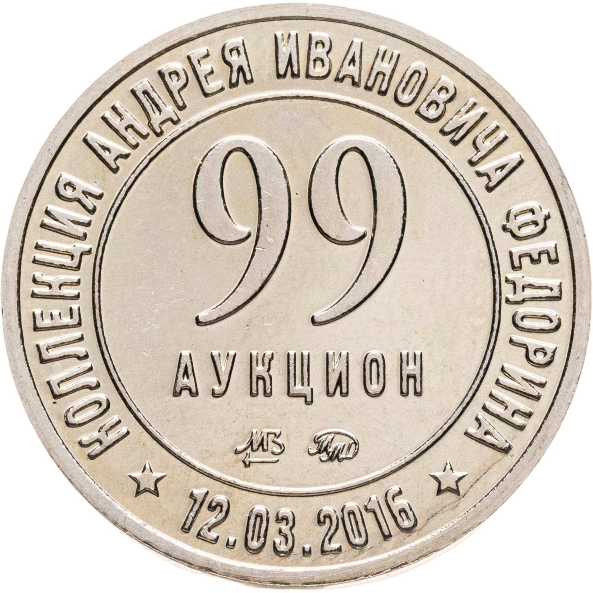 Жетон фирмы «Монеты и медали». Коллекция советских монет Андрея Ивановича Федорина. 12.03.2016, ММД, 2016 г. Нейзильбер, диаметр 18 мм, Московский монетный двор. Тираж: 500 шт. Памятный жетон отчеканен к аукциону нумизматической фирмы «Монеты и медали» № 99, где продавалась коллекция Федорина Андрея Ивановича, автора каталога «Монеты Страны Советов 1921-1991». Нумизматический аукцион фирмы Монеты и медали» № 99 состоялся 12 марта 2016 г. На аукционе было выставлено 412 лотов.