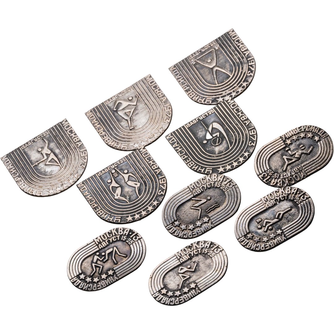 Купить Комплект из 10-ти сувенирных памятных значков с видами спортивных состязаний игр VII летней Универсиады в Москве 15-25 августа 1973, СССР, 1970-е гг.