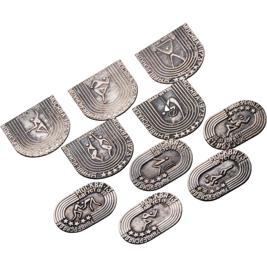 Комплект из 10-ти сувенирных памятных значков с видами спортивных состязаний игр VII летней Универсиады в Москве 15-25 августа 1973, СССР, 1970-е гг.