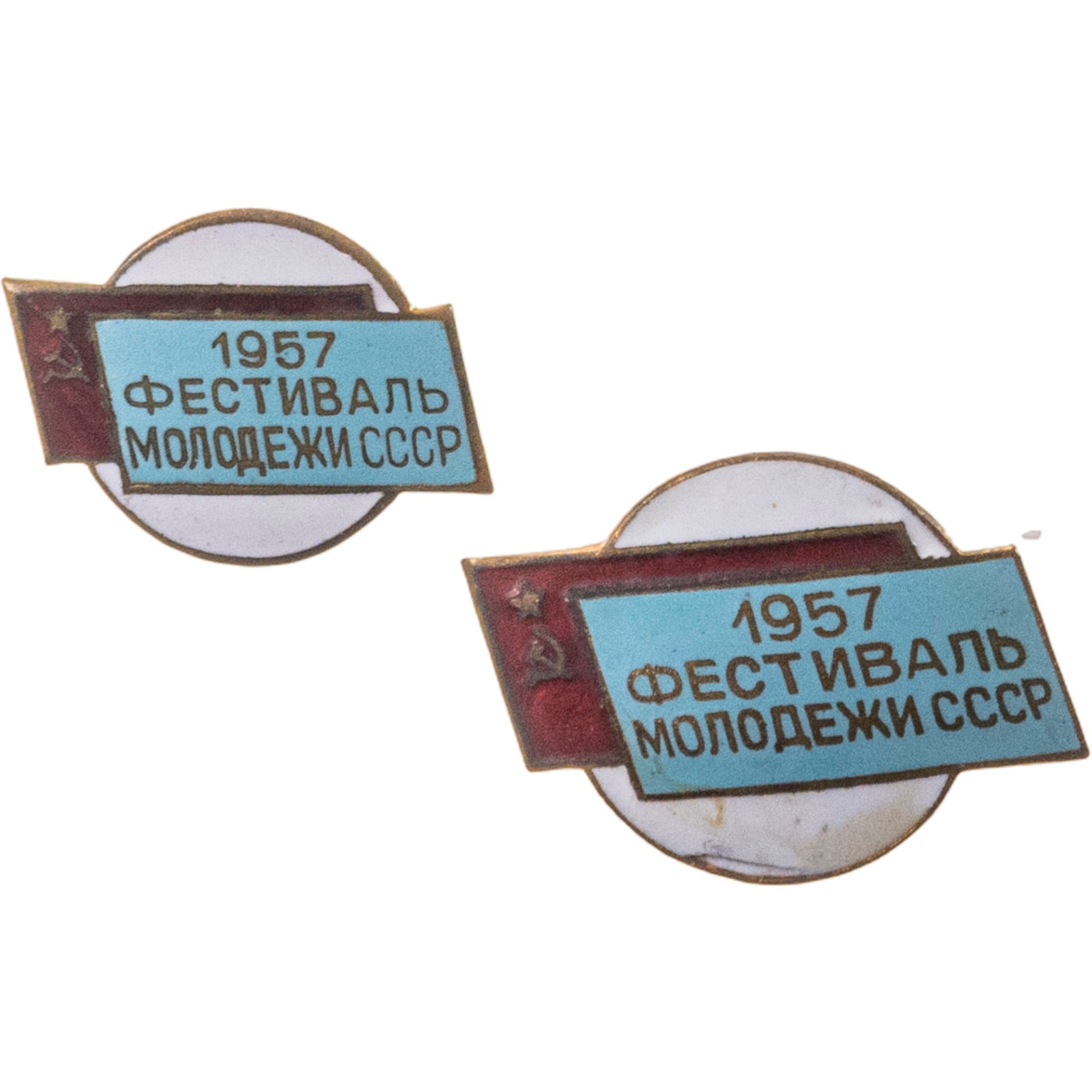 Подборка из 2-х памятных знаков "Фестиваль молодежи СССР 1957" (малый и большой), томпак, эмаль, булавка. СССР, ММД, 1950-е гг.