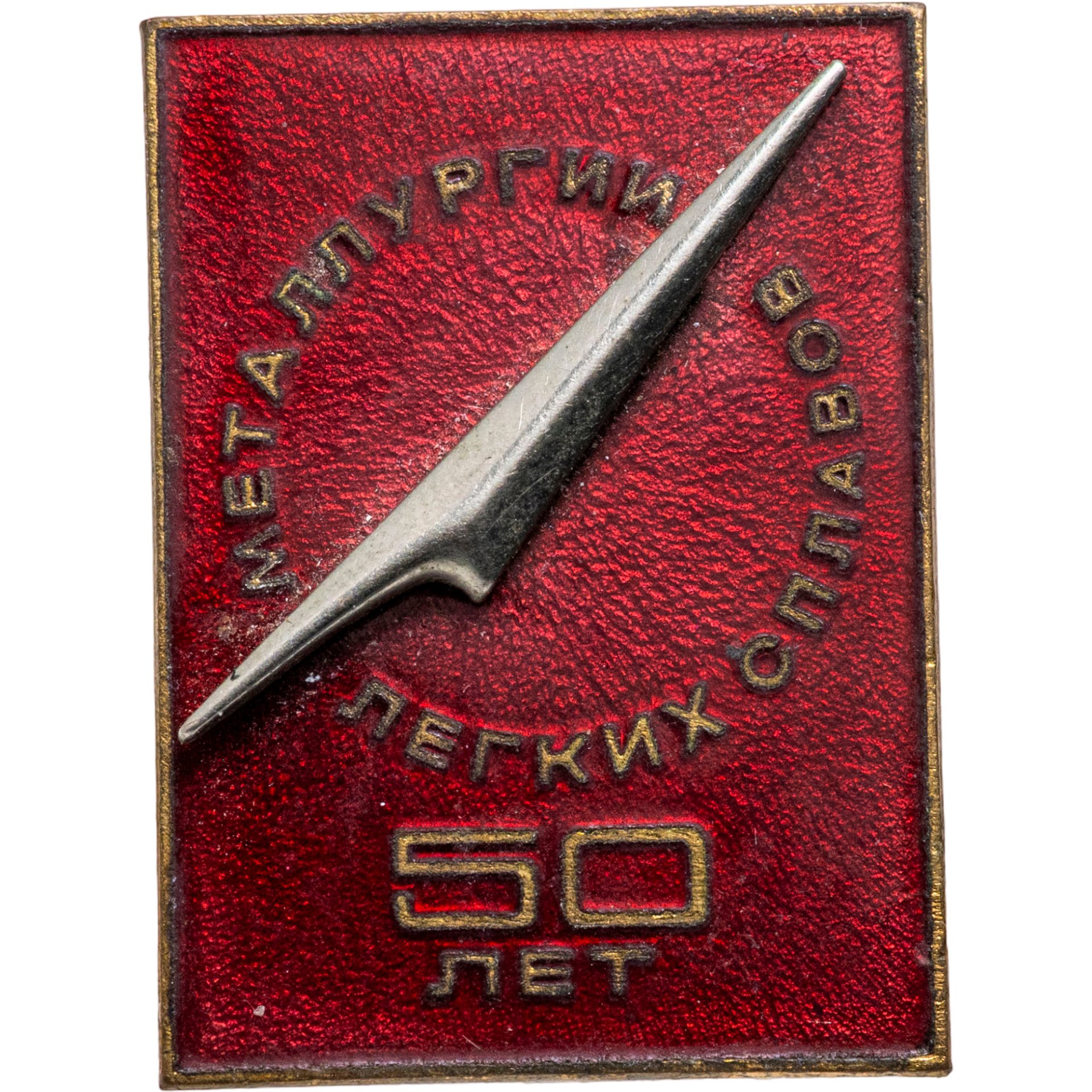 Памятный знак в честь 50-летия металлургии легких сплавов, томпак, эмаль, булавка. СССР, ММД, 1980-е гг.