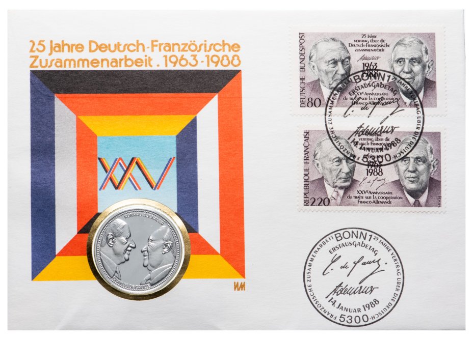 Германия, ФРГ 1988 медаль "25 лет Елисейскому договору" в конверте с маркой